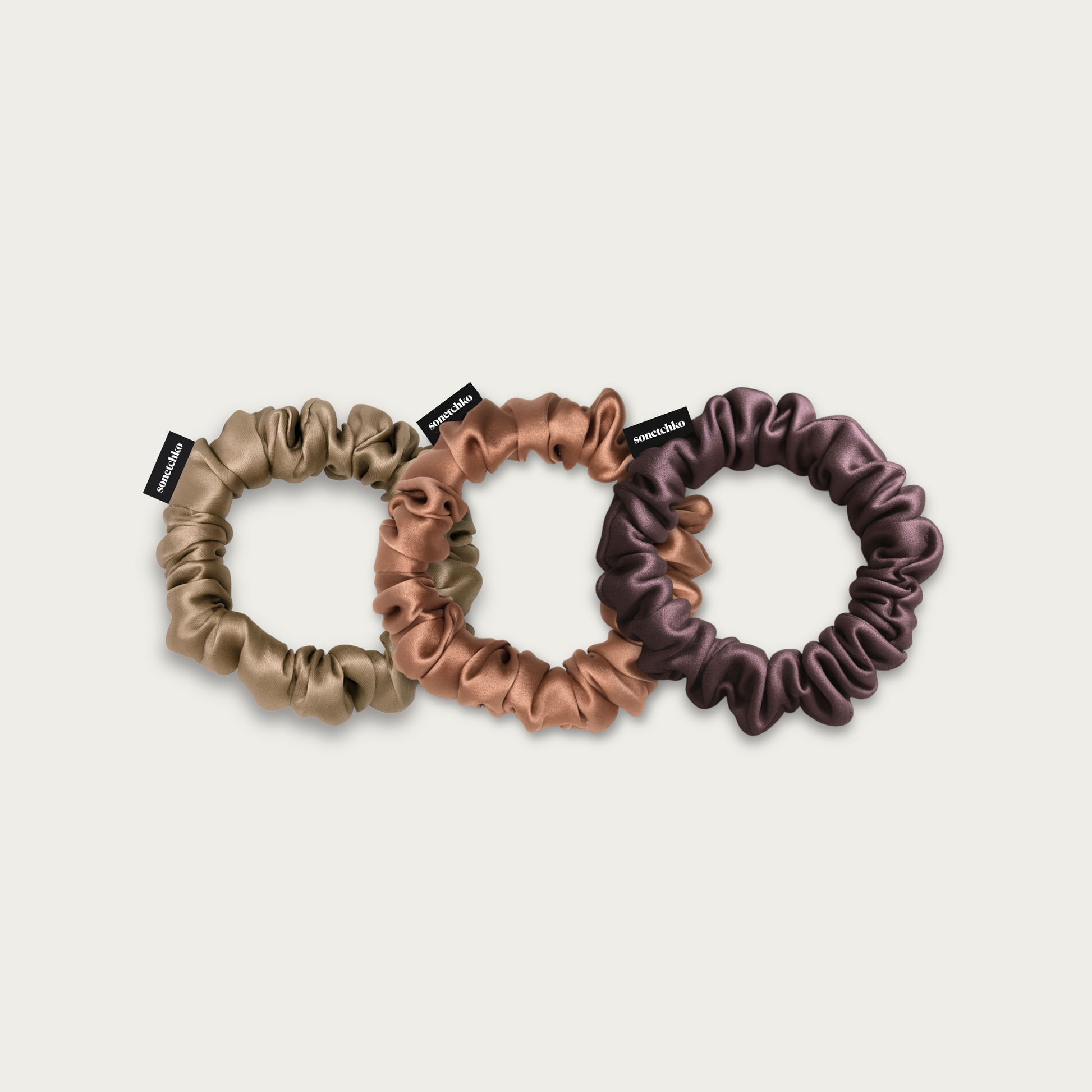 Le lot Nude est composé de 3 chouchous en soie de modèle Fin avec les coloris suivants : beige, rosé et rose chocolat.